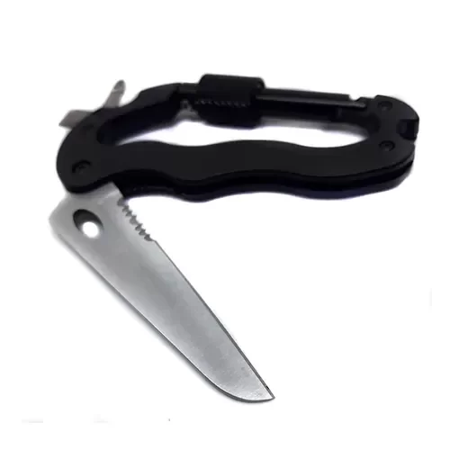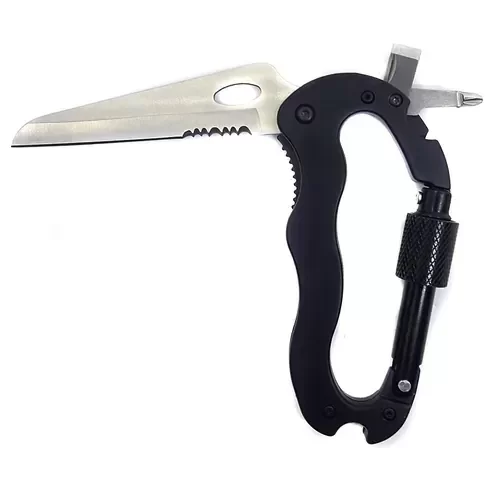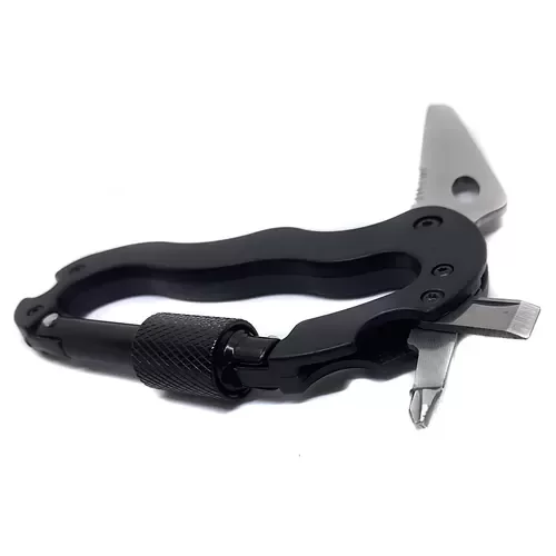 El mosquetón 5 en 1 es un mosquetón estilo carabinero con, corta pluma, destornillador de punta plana, destornillador de punta cruz y destapador.