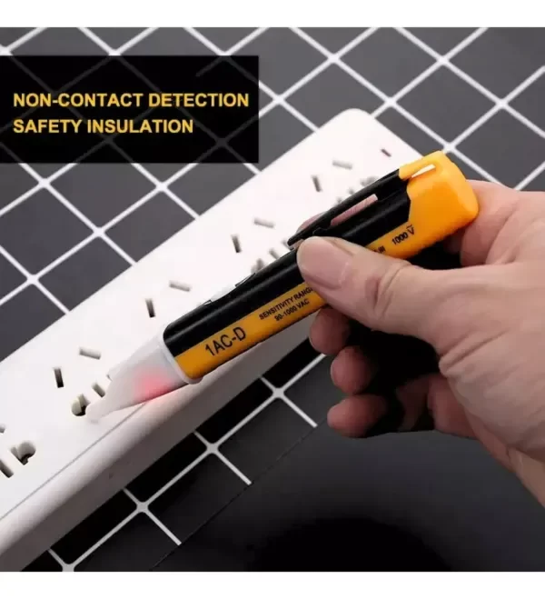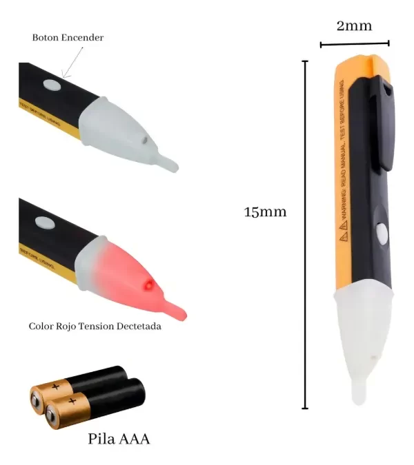 El Lápiz Tester Alerta De Voltaje Busca Polo Detector + Pilas es una herramienta indispensable para cualquier profesional o aficionado a la electricidad. Este busca polo inductivo detecta voltaje sin contacto, ofreciendo una detección precisa y segura de electricidad por proximidad. Con un rango de voltaje de 90V a 1000V AC, es ideal para una amplia variedad de aplicaciones. Su diseño cumple con los estándares IP54 e IEC 1010, garantizando durabilidad y resistencia. Incluye 2 pilas AAA que proporcionan hasta 6 horas de uso continuo y un año y medio en modo standby. Además, cuenta con una linterna integrada para trabajar en condiciones de poca luz y un indicador luminoso y sonoro que alerta de la presencia de voltaje. Este modelo, DE1AC-D, es inalámbrico y no tiene fecha de vencimiento, lo que lo convierte en una herramienta confiable y duradera