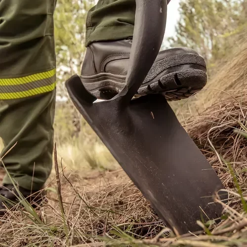 Posee una pisada en la hoja para presionar con el pie sin el riesgo de dañar la suela del calzado cuando la misma está caliente por su uso en incendio.