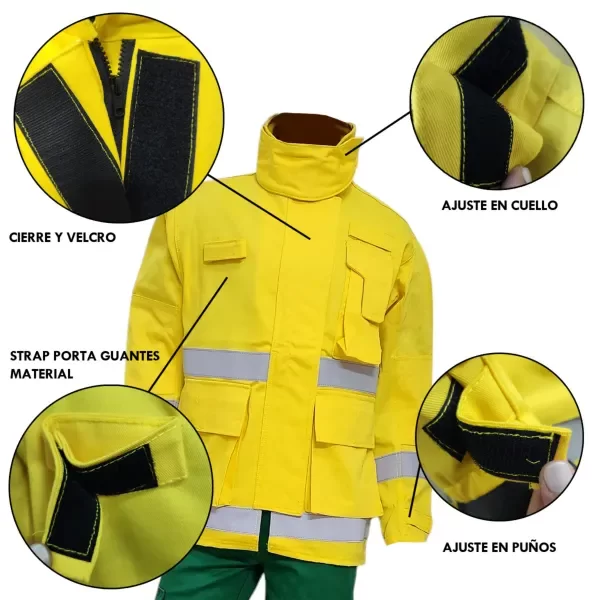 Ajuste en puños con velcro, asegurando un cierre hermético y evitando la exposición al fuego.
