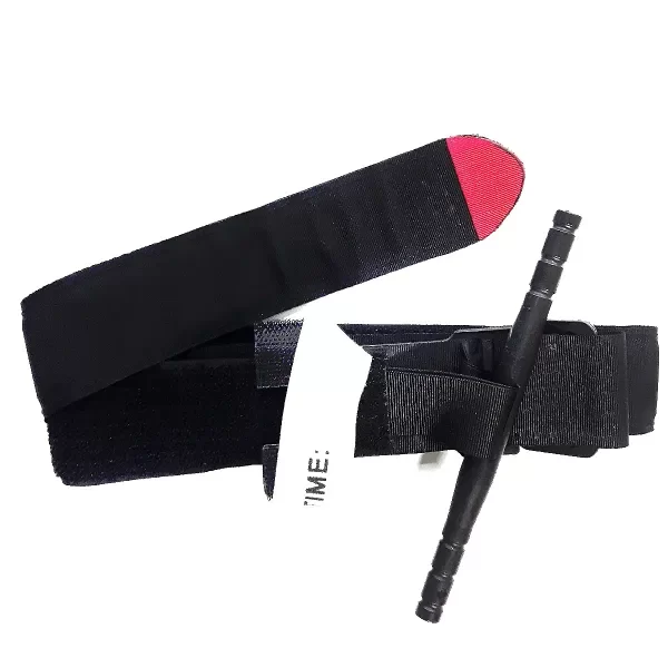 Torniquete Táctico tipo CAT: Sistema de hebilla autoajustable, velcro de alta resistencia y varilla de compresión reforzada. Permite una aplicación de una sola mano y es efectivo para detener hemorragias en extremidades en segundos.