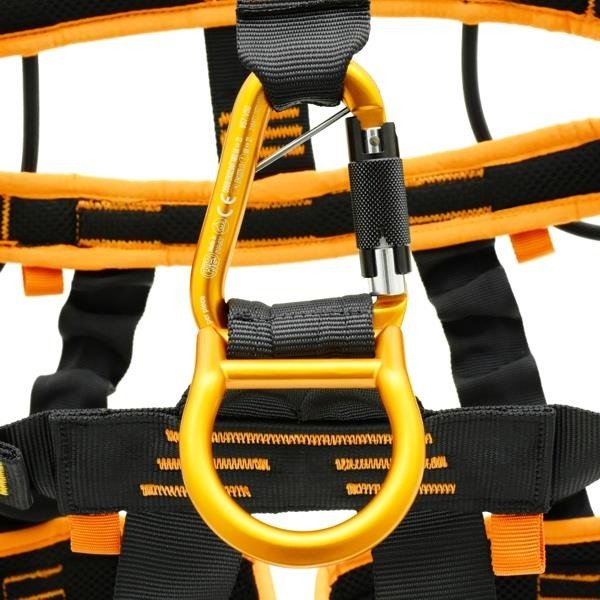- Equipado con tres puntos de anclaje (ventral, esternal y dorsal) y dos anillos laterales de posicionamiento en aleación ligera, que pueden bloquearse en posición cerrada para evitar enganches accidentales.